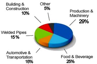 فولادهای ضدزنگ کاربردهای بسیاروسیع و گسترده ای در زندگی مدرن امروز دارند این دسته فولادها به آسانی تمیز گشته و برای استفاده درمصارف بهداشتی توصیه می گردند و هزینه های نگهداری قطعات ساخته شده با آن به مراتب پائین است.استنلس استیل پتانسیل بالایی برای کاربرد درمصارف گوناگون داراست . بدلیل خواص شیمیایی و مکانیکی ویژه ای که این فولاد دارا می باشد لوله های ساخته شده ازآن بهترین استعمال رابرای انتقال سیالات خورنده دارند. لوله های استنلس همچنین به لحاظ ظاهرتمیز و زیبایی که دارند استفاده های مبرمی در صنایع تزئینی و بهداشتی دارا می باشند . موارد کاربرد استنلس استیل در بخشهای مختلف صنعت در نمودار روبرو آمده است.